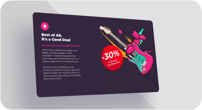 9 Best of All, it’s a Good Deal Exclusive discount from RELAYTO -30% While some conferences charge up to $2000, SaaStock Dublin is more accessible. Tickets for founders and executives are €1099 (€769.30 with our promo code) for a full conference day. Whether you're looking for a full SaaStock experience or just a taste of it, grab the ticket you need here. Use our special promo code and get 30% off the price of your ticket.