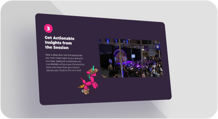 3 Get Actionable Insights from the Session Take a deep dive into the topics that are most meaningful to you and your business. SaaStock workshops and roundtables will give you the practical tools and know-how you need to elevate your SaaS to the next level.