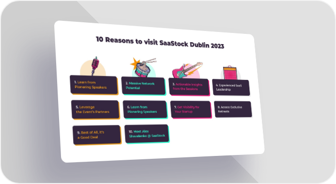 10 Reasons to visit SaaStock Dublin 2023 1. Learn from 2. Massive Network 3. Actionable Insights 4. Experienced SaaS Pionering Speakers Potential from the Sessions Leadership 5. Leverage 6. Learn from 7. Get Visibility for 8. Access Exclusive the Event’s Partners Pionering Speakers Your Startup Retreats 9. Best of All, it’s 10. Meet Alex a Good Deal Shevelenko @ SaaStock