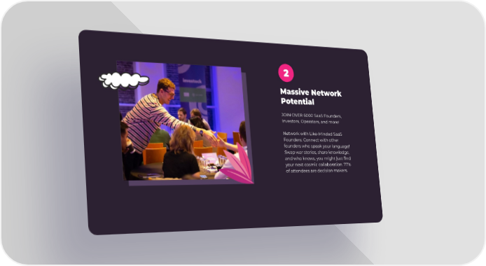 2 Massive Network Potential JOIN OVER 6000 SaaS Founders, Investors, Operators, and more! Network with Like-Minded SaaS Founders: Connect with other founders who speak your language! Swap war stories, share knowledge, and who knows, you might just find your next cosmic collaboration. 77% of attendees are decision makers.