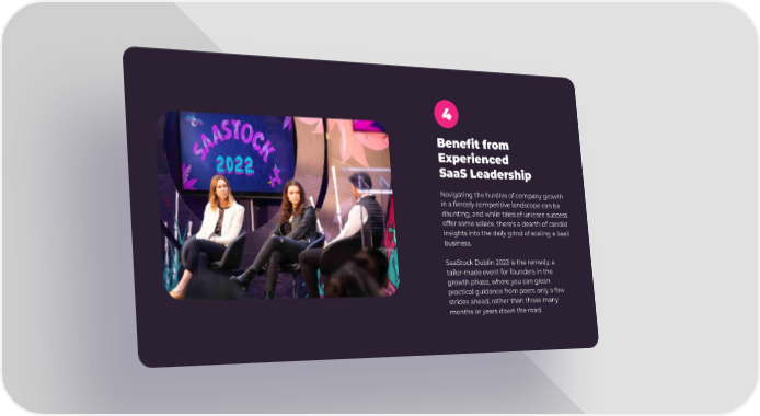 4 Benefit from Experienced SaaS Leadership Navigating the hurdles of company growth in a fiercely competitive landscape can be daunting, and while tales of unicorn success offer some solace, there's a dearth of candid insights into the daily grind of scaling a SaaS business. SaaStock Dublin 2023 is the remedy, a tailor-made event for founders in the growth phase, where you can glean practical guidance from peers only a few strides ahead, rather than those many months or years down the road.