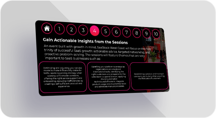 Hiring a team, reducing churn and increasing staff retention in light of big tech competitors that offer insane salaries and benefits. 1 2 3 4 5 6 7 8 9 10 4 Managing friction between the Gain Actionable Insights from the Sessions product and commercial team to deliver a product that your customer needs and wants. An event built with growth in mind, SaaStock West Coast will focus on the holy trinity of successful SaaS growth: actionable advice, targeted networking, and proactive problem-solving. The sessions will feature themes that are very important to SaaS businesses such as: Actionable Upselling your platform to enterprise Upselling your platform to enterprise Optimizing and adjusting your service organizations on a local and organizations on a local and Insights model to make it financially viable for international scale, identifying the international scale, identifying the Establishing a product and SMBs, resolving pricing strategy when right customers and prospects for the moving it upstream, right customers and prospects for the Establishing a product and moving it sales team to spend time on, applying working with smaller contracts, particularly when acquiring sales team to spend time on, applying upstream, particularly when acquiring AI and automation the first batch of customers.offering the right service support and techniques/software to integrate AI and automation the first batch of customers. onboarding, reducing inefficiencies by product usage data to prioritize leads techniques/software to integrate and eliminate manual processes. creating a self-sufficient product and product usage data to prioritize leads experience. and eliminate manual processes.