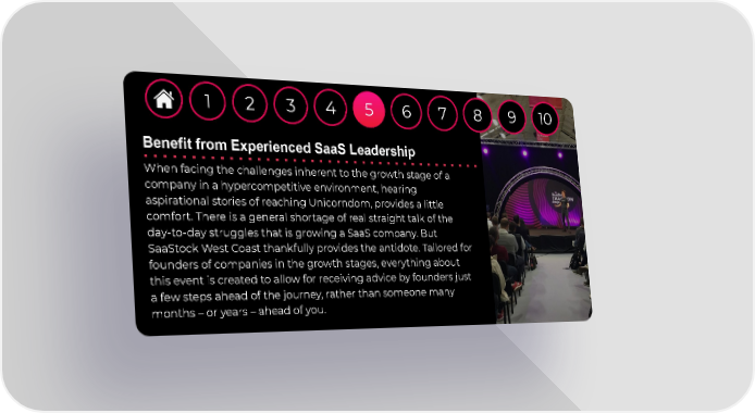 1 2 3 4 5 6 7 8 9 10 5 Benefit from Experienced SaaS Leadership When facing the challenges inherent to the growth stage of a company in a hypercompetitive environment, hearing aspirational stories of reaching Unicorndom, provides a little comfort. There is a general shortage of real straight talk of the day-to-day struggles that is growing a SaaS company. But SaaStock West Coast thankfully provides the antidote. Tailored for founders of companies in the growth stages, everything about this event is created to allow for receiving advice by founders just a few steps ahead of the journey, rather than someone many months – or years – ahead of you.