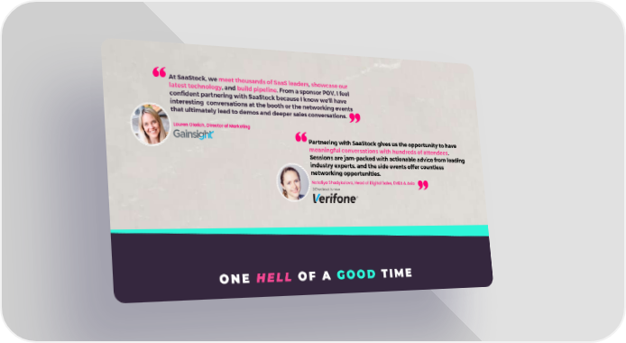 At SaaStock, we meet thousands of SaaS leaders, showcase our latest technology, and build pipeline. From a sponsor POV, I feel confident partnering with SaaStock because I know we'll have interesting conversations at the booth or the networking events that ultimately lead to demos and deeper sales conversations. Lauren Olerich, Director of Marketing Partnering with SaaStock gives us the opportunity to have meaningful conversations with hundreds of attendees. Sessions are jam-packed with actionable advice from leading industry experts, and the side events offer countless networking opportunities. Nataliya Shadykulova, Head of Digital Sales, EMEA & Asia ONE HELL OF A GOOD TIME