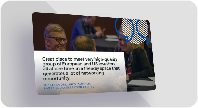 Great place to meet very high-quality Great place to meet very high-quality group of European and US investors, group of European and US investors, all at one time, in a friendly space that all at one time, in a friendly space that generates a lot of networking generates a lot of networking opportunity. opportunity. JONATHAN DRILLINGS, PARTNER, RIVERSIDE ACCELERATION CAPITAL