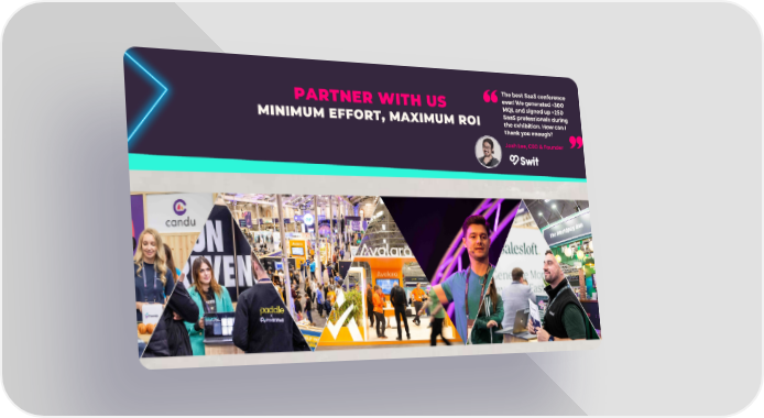 The best SaaS conference ever! We generated +300 PARTNER WITH US MQL and signed up +250 SaaS professionals during MINIMUM EFFORT, MAXIMUM ROI the exhibition. How can I thank you enough? Josh Lee, CEO & Founder