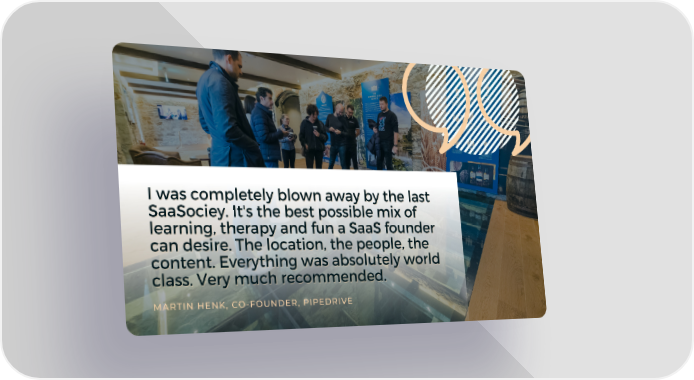 I was completely blown away by the last I was completely blown away by the last SaaSociey. It's the best possible mix of SaaSociey. It's the best possible mix of learning, therapy and fun a SaaS founder learning, therapy and fun a SaaS founder can desire. The location, the people, the can desire. The location, the people, the content. Everything was absolutely world content. Everything was absolutely world class. Very much recommended. class. Very much recommended. MARTIN HENK, CO-FOUNDER, PIPEDRIVE