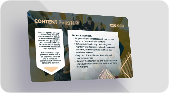CONTENTPARTNER CONTENT Join the agenda through collaborating with the PACKAGE INCLUDES: content team to deliver Opportunity to collaborate with our content a focussed roundtable session, and get up close team on the roundtable content and personal with our 2x tickets to SaaSociety - including two founders whilst leading nights in five-star resort hotel, all meals and a structured discussion on a hot topic. activities, and transport to and from the conference venue You’ll receive a large presence at the venue, Logo and link on the event website and on the event website marketing emails and in invitation / communication emails Copy of the attendee list and assistance with across the portfolio. introductions in advance of the event (GDPR compliant)