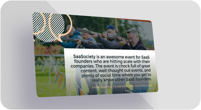 SaaSociety is an awesome event for SaaS SaaSociety is an awesome event for SaaS founders who are hitting scale with their founders who are hitting scale with their companies. The event is chock full of great companies. The event is chock full of great content, well-thought out events, and content, well-thought out events, and plenty of social time where you get to plenty of social time where you get to really know other SaaS founders. really know other SaaS founders. VIVEK SHARMA, FOUNDER & CEO, MOVEABLE INK