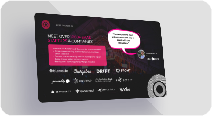 MEET FOUNDERS MEET OVER 1000+ SAAS STARTUPS & COMPANIES • Receive the full Startup & Company list before the event • Access the networking platform to book-in meetings before the event • Founder 1-1 matchmaking sessions by stage and region • Judge the our global pitch competition • Run founder workshops for 50+ target founders