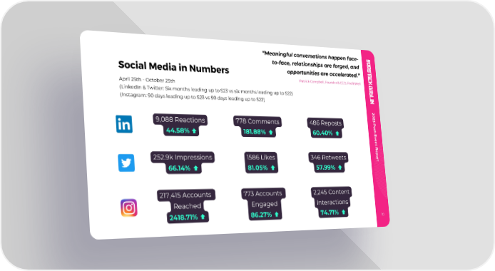 “Meaningful conversations happen face- to-face, relationships are forged, and opportunities are accelerated.” Social Media in Numbers Patrick C ampbell, Founder & CEO, ProfitWell April 25th - October 25th (LinkedIn & Twitter: Six months leading up to S23 vs six months leading up to S22) (Instagram: 90 days leading up to S23 vs 90 days leading up to S22) 2 0 2 3 P 9,088 Reactions 778 Comments 486 Reposts o s t - E 44.58% 181.88% 60.40% v e n t R e p o r 252.9k Impressions 1586 Likes 346 Retweets t 66.14% 81.05% 57.99% 217,415 Accounts 773 Accounts 2,245 Content Reached Engaged Interactions 2418.71% 86.27% 74.71% 10