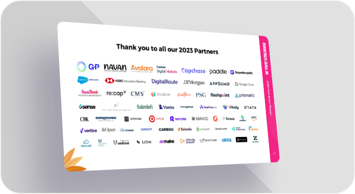 SaaStock Dublin 2023 Post Event Report Page 18 Page 20Thank you to all our 2023 Partners OFFICIAL TRAVEL PARTNER 22 00 22 33 PP oo ss tt -- EE vv ee nn tt RR ee pp oo rr tt 20 19