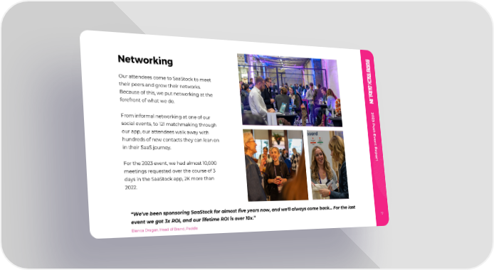 Networking Our attendees come to SaaStock to meet their peers and grow their networks. Because of this, we put networking at the forefront of what we do. 2 0 2 3 From informal networking at one of our P o s social events, to 121 matchmaking through t - E v our app, our attendees walk away with e n hundreds of new contacts they can lean on t R e in their SaaS journey. p o r t For the 2023 event, we had almost 10,000 meetings requested over the course of 3 days in the SaaStock app, 2K more than 2022. “We've been sponsoring SaaStock for almost five years now, and we'll always come back... For the last event we got 3x ROI, and our lifetime ROI is over 10x.” 17 Bianca Dragan, Head of Brand, Paddle