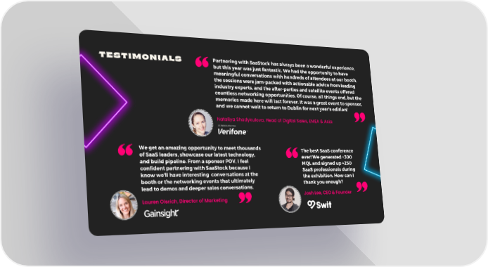 Partnering with SaaStock has always been a wonderful experience, TESTIMONIALS TESTIMONIALS but this year was just fantastic. We had the opportunity to have meaningful conversations with hundreds of attendees at our booth, the sessions were jam-packed with actionable advice from leading industry experts, and the after-parties and satellite events offered countless networking opportunities. Of course, all things end, but the memories made here will last forever. It was a great event to sponsor, and we cannot wait to return to Dublin for next year’s edition! Nataliya Shadykulova, Head of Digital Sales, EMEA & Asia We get an amazing opportunity to meet thousands The best SaaS conference of SaaS leaders, showcase our latest technology, ever! We generated +300 and build pipeline. From a sponsor POV, I feel MQL and signed up +250 confident partnering with SaaStock because I SaaS professionals during know we'll have interesting conversations at the the exhibition. How can I booth or the networking events that ultimately thank you enough? lead to demos and deeper sales conversations. Josh Lee, CEO & Founder Lauren Olerich, Director of Marketing