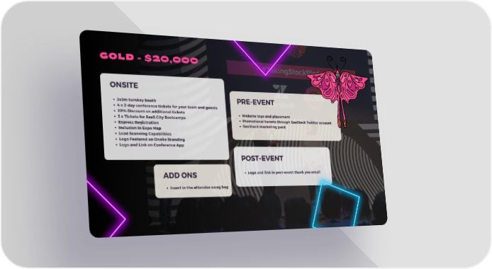 GOLD - $20,000 ONSITE ONSITE PRE-EVENT 3x3m turnkey booth 4 x 2-day conference tickets for your team and guests 20% Discount on additional tickets Website logo and placement 3 x Tickets for SaaS.City Bootcamps Promotional tweets through SaaStock Twitter account Express Registration SaaStock marketing pack Inclusion in Expo Map Lead Scanning Capabilities Logo Featured on Onsite Branding Logo and Link on Conference App POST-EVENT Logo and link in post-event thank you email ADD ONS Insert in the attendee swag bag