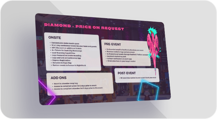 DIAMOND - PRICE ON REQUEST ONSITE Customisable 8x8m booth space PRE-EVENT 10 x 2-day conference tickets for your team and guests 40% Discount on additional tickets Co-branded email to SaaStock attendees pre-event 6 x Tickets for SaaS.City Bootcamps Premium website logo and placement Lead Scanning Capabilities 1x Promotional tweets through SaaStock Twitter account Logo Featured on Onsite Branding SaaStock marketing pack Logo and Link on Conference App 1x Push notification on event app Express Registration 10 introductions to your target market Inclusion in Expo Map Partner events to feature in NightStock POST-EVENT ADD ONS 50-word description in post-event thank you email Insert in attendee swag bag Access to compliant press list 5 days prior to event Access to compliant attendee list 5 days prior to the event