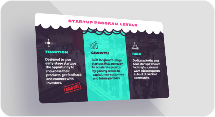 STARTUP PROGRAM LEVELS TRACTION GROWTH RISE Designed to give Built for growth-stage Dedicated to the best early-stage startups startups that are ready SaaS startups who are the opportunity to to accelerate growth looking to scale and showcase their by gaining access to want added exposure products, get feedback capital, new customers in front of our SaaS and connect with and future partners. community. investors.