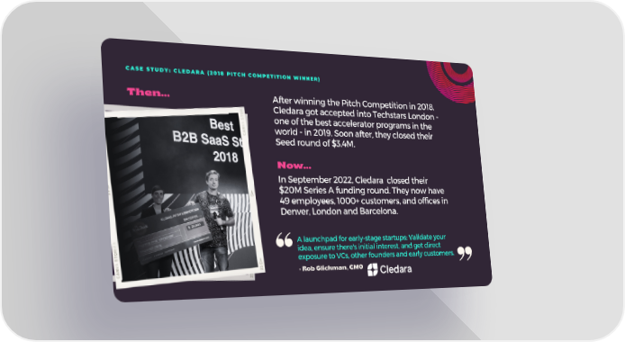 CASE STUDY: CLEDARA (2018 PITCH COMPETITION WINNER) Then... After winning the Pitch Competition in 2018, Cledara got accepted into Techstars London - one of the best accelerator programs in the world - in 2019. Soon after, they closed their Seed round of $3.4M. Now... In September 2022, Cledara closed their $20M Series A funding round. They now have 49 employees, 1000+ customers, and offices in Denver, London and Barcelona. A launchpad for early-stage startups: Validate your idea, ensure there's initial interest, and get direct exposure to VCs, other founders and early customers. - Rob Glickman, CMO