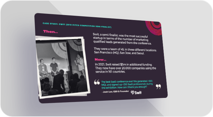 CASE STUDY: SWIT (2019 PITCH COMPETITION SEMI-FINALIST) Then... Swit, a semi-finalist, was the most successful startup in terms of the number of marketing qualified leads generated from the conference. They were a team of 45, in three different locations: San Francisco (HQ), San Jose, and Seoul. Now... In 2021, Swit raised $5m in additional funding. They now have over 20,000 companies using the service in 161 countries. The best SaaS conference ever! We generated +300 MQL and signed up +250 SaaS professionals during the exhibition. How can I thank you enough? - Josh Lee, CEO & Founder