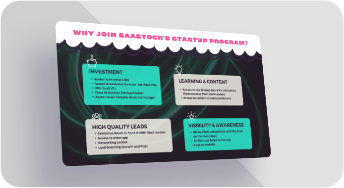 WHY JOIN SAASTOCK'S STARTUP PROGRAM? INVESTMENT Access to Investor Lists LEARNING & CONTENT Access to exclusive Investor matchmaking 100+ SaaS VCs Access to the Startup Day with interactive Place in Investor Startup Booklet Masterclasses from SaaS Leaders Access to our Investor Relations Manager Access to content at main conference VISIBILITY & AWARENESS HIGH QUALITY LEADS Exhibition Booth in front of 800+ SaaS Leaders Global Pitch Competition with the final Access to event app on the main stage Networking parties All Startups listed on the app Lead Scanning (Growth and Rise) Logo on website