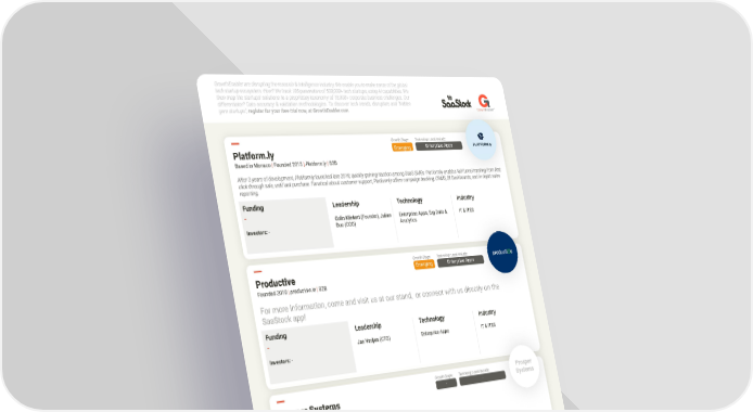 GrowthEnabler are disrupting the research & intelligence industry. We enable you to make sense of the global tech startup ecosystem. How? We track 185 parameters of 500,000+ tech startups, using AI capabilities. We then map the startups' solutions to a proprietary taxonomy of 15,000+ corporate business challenges. Our differentiator? Data accuracy & validation methodologies. To discover tech trends, disruptors and "hidden r ™ Enable owth r gem startups", register for your free trial now, at GrowthEnabler.com G Growth Stage:Technology used include: Platform.ly Emerging Enterprise Apps Based in Monaco | Founded 2015 | Platform.ly | B2B After 3 years of development, Platformly launched late 2018; quickly gaining traction among SaaS SMEs. Platformly enables full-funnel tracking from first click through sale, until last purchase. Fanatical about customer support, Platformly offers campaign tracking, CRMS, BI Dashboards, and in depth sales reporting. Funding Leadership Technology Industry - Colin Klinkert (Founder), Julien Enterprise Apps, Big Data & IT & ITES Investors: - Duc (COO) Analytics Growth Stage:Technology used include: Productive Emerging Enterprise Apps Founded 2010 | productive.io | B2B For more information, come and visit us at our stand, or connect with us directly on the SaaStock app! Funding Leadership Technology Industry - Jan Varljen (CTO) Enterprise Apps IT & ITES Investors: - Growth Stage:Technology used include: Prosper Prosper Systems - - Systems prosper-systems.com For more information, come and visit us at our stand, or connect with us directly on the SaaStock app! Funding Leadership Technology Industry - - - - Investors: - Growth Stage:Technology used include: Quorum Emerging Blockchain Based in France | Founded 2017 | quorum.co | B2B Quorum equips NGOs, campaigners, civil society with powerful technology to optimize their on-the-ground operations through data; together with their teams & volunteers - to consult, mobilize, and fundraise better. Quorum's two founders aim to spark change by removing all barriers to action, making the volunteering process seamless & accessible. Funding Leadership Technology Industry - Florent Barre (Co-Founder & Blockchain, GovTech, Other Investors: - CEO), Jean-Baptiste Daniel Consumer Apps, FinTech, Big (Co-Founder & CTO), Maxime Data & Analytics Beylot (Co-Founder) 21 | SaaStock Dublin 2018 - Startup Overview