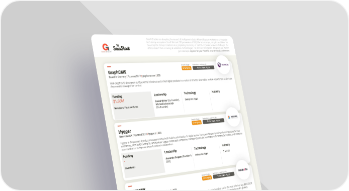 GrowthEnabler are disrupting the research & intelligence industry. We enable you to make sense of the global tech startup ecosystem. How? We track 185 parameters of 500,000+ tech startups, using AI capabilities. We then map the startups' solutions to a proprietary taxonomy of 15,000+ corporate business challenges. Our differentiator? Data accuracy & validation methodologies. To discover tech trends, disruptors and "hidden r ™ Enable owth r G gem startups", register for your free trial now, at GrowthEnabler.com Growth Stage:Technology used include: GraphCMS Emerging Enterprise Apps Based in Germany | Founded 2017 | graphcms.com | B2B With GraphCMS, developers build powerful infrastructure for their digital products in a matter of minutes. Meanwhile, content creators have all the tools they need to manage their content. Funding Leadership Technology Industry $1.00M Daniel Winter (Co-Founder), Enterprise Apps - Investors: Paua Ventures Michael Lukaszczyk (Co-Founder) Growth Stage:Technology used include: Hygger Emerging Enterprise Apps Based in USA | Founded 2017 | hygger.io | B2B Hygger is the product & project management tool with built-in prioritization for Agile teams. Teams use Hygger to define what's important for their customers, then build it using Scrum/Kanban. Hygger helps agile companies manage ideas, build roadmaps, enhance product quality, and centralise communication to improve cross-functional collaboration. Funding Leadership Technology Industry - Alexander Sergeev (Founder & Enterprise Apps IT & ITES Investors: - CEO) Growth Stage:Technology used include: INDIDESK Emerging Enterprise Apps Based in Spain | Founded 2017 | indidesk.tech | B2B INDIDESK is the productivity workplace that offers powerful tools to manage resources and projects agilest and in the most effective way. INDIDESK focuses on productivity and effectiveness offering every user, an intuitive experience, and functionalities that enhance projects results globally. Funding Leadership Technology Industry $0.49M Diego Santiago (Co-Founder & Enterprise Apps - Investors: - CEO) Growth Stage:Technology used include: InfiniGrow Emerging Enterprise Apps infinigrow.com For more information, come and visit us at our stand, or connect with us directly on the SaaStock app! Funding Leadership Technology Industry - - - IT & ITES Investors: - Startup Overview - SaaStock Dublin 2018 | 16