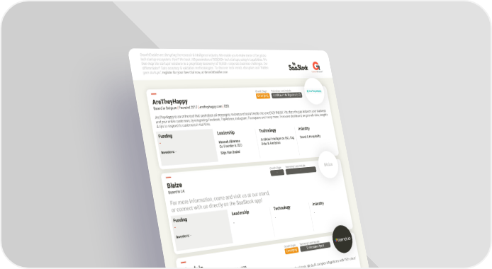 GrowthEnabler are disrupting the research & intelligence industry. We enable you to make sense of the global tech startup ecosystem. How? We track 185 parameters of 500,000+ tech startups, using AI capabilities. We then map the startups' solutions to a proprietary taxonomy of 15,000+ corporate business challenges. Our differentiator? Data accuracy & validation methodologies. To discover tech trends, disruptors and "hidden r ™ Enable owth r gem startups", register for your free trial now, at GrowthEnabler.com G Growth Stage:Technology used include: AreTheyHappy Emerging Artificial Intelligence (AI) Based in Belgium | Founded 2017 | aretheyhappy.com | B2B AreTheyHappy is an online tool that centralises all messages, reviews and social media into one EASY INBOX. We close the gap between your business and your online customers, by integrating Facebook, TripAdvisor, Instagram, Foursquare and many more. From one dashboard, we provide data, insights & tips to respond to customers in real-time. Funding Leadership Technology Industry - Hannah Albarece Artificial Intelligence (AI), Big Travel & Hospitality Investors: - Co-Founder & CEO Data & Analytics Stijn Van Brakel Growth Stage:Technology used include: Blaize Blaize - - Based in UK For more information, come and visit us at our stand, or connect with us directly on the SaaStock app! Funding Leadership Technology Industry - - - - Investors: - Growth Stage:Technology used include: Blendr.io Emerging Enterprise Apps Based in Belgium | Founded 2017 | blendr.io | B2B Blendr.io is a data integration and cloud automation platform for sales, marketing & events cloud tools. We build complex integrations with 150+ cloud tools and automate any workflow across your applications; triggering powerful multi-platform workflows. SaaS companies use Blendr.io to supercharge or outsource their data integration efforts." Funding Leadership Technology Industry - Niko Nelissen Enterprise Apps, HealthTech IT & ITES Investors: - Founder Ekaterina Kazakova Marketing Manager Growth Stage:Technology used include: Book like a boss Emerging RetailTech Based in Israel | Founded 2016 | booklikeaboss.com | B2B & B2C Book Like A Boss is a software platform that makes it simple for anyone to sell services and manage their business (or millenial side-hustle). Whilst products typically sell on marketplaces (eBay, Amazon...) oe e-commerce platforms (Shopify...), if you want to sell your services, you can build your own service website using Book Like A Boss! Funding Leadership Technology Industry $0.20 M (Angel/Seed) Nachum Kligman PaaS, RetailTech, Enterprise Retail, Advertising, IT & ITES Investors: - Co-Founder & CEO Apps, Consumer Apps Dovid Yudkowitz Co-Founder & CTO 09 | SaaStock Dublin 2018 - Startup Overview