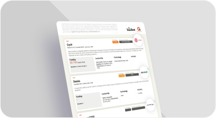 GrowthEnabler are disrupting the research & intelligence industry. We enable you to make sense of the global tech startup ecosystem. How? We track 185 parameters of 500,000+ tech startups, using AI capabilities. We then map the startups' solutions to a proprietary taxonomy of 15,000+ corporate business challenges. Our differentiator? Data accuracy & validation methodologies. To discover tech trends, disruptors and "hidden r ™ Enable owth r gem startups", register for your free trial now, at GrowthEnabler.com G Growth Stage:Technology used include: Cyclr Scaling Enterprise Apps Based in UK | Founded 2014 | cyclr.com | B2B Cyclr provides an integration platform enabling SaaS companies to enhance their delivery of integrations, automations and workflows to their end-users. Cyclr exists 'behind the scenes' saving time & overhead; an API is turned from a back-end developer feature into a front-end. Our drag & drop visual language has been created with leading academics. Funding Leadership Technology Industry $0.71M (Angel/Seed) Colin Smith (Chairman), Fraser PaaS, Enterprise Apps, IaaS- Investors: Creative England Davidson (Co-Founder & CEO), Philip Bryan (Co-Founder & CTO) Growth Stage:Technology used include: Demio Emerging Other Founded 2014 | demio.com | B2B A hassle-free webinar platform built for marketing. Demio makes it easy for marketers to run successful webinar campaigns without the technical headache. Funding Leadership Technology Industry - Wyatt Jozwowski Other IT & ITES Investors: - (Co-Founder), David Abrams (Co-Founder) Growth Stage:Technology used include: Document360 - - document360.io For more information, come and visit us at our stand, or connect with us directly on the SaaStock app! Funding Leadership Technology Industry - - - - Investors: - Growth Stage:Technology used include: EdgeTier - - edgetier.com For more information, come and visit us at our stand, or connect with us directly on the SaaStock app! Funding Leadership Technology Industry - - - - Investors: - 13 | SaaStock Dublin 2018 - Startup Overview