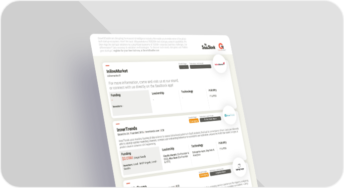 GrowthEnabler are disrupting the research & intelligence industry. We enable you to make sense of the global tech startup ecosystem. How? We track 185 parameters of 500,000+ tech startups, using AI capabilities. We then map the startups' solutions to a proprietary taxonomy of 15,000+ corporate business challenges. Our differentiator? Data accuracy & validation methodologies. To discover tech trends, disruptors and "hidden r ™ Enable owth r gem startups", register for your free trial now, at GrowthEnabler.com G Growth Stage:Technology used include: InlineMarket - - inlinemarket.fi For more information, come and visit us at our stand, or connect with us directly on the SaaStock app! Funding Leadership Technology Industry - - - IT & ITES Investors: - Growth Stage:Technology used include: InnerTrends Emerging Enterprise Apps Based in UK | Founded 2015 | innertrends.com | B2B InnerTrends uses machine learning & data-science to expose behavioural patterns in SaaS products, that lead to conversion or churn. Users are inherently able to identify optimal marketing channels, correlate user onboarding behaviour to successful user activation, uncover the 'North Star Metric' of apps, & predict churn in advance of it happeneing. Funding Leadership Technology Industry $0.09M (Angel/Seed) Claudiu Murariu (Co-Founder & Enterprise Apps, Big Data & IT & ITES Investors: Lead - MVP Angels, Lead - CEO), Alex Stoia (Co-Founder Analytics Seedrs & CTO) Growth Stage:Technology used include: ItsMyCargo Emerging LogisticsTech Based in Germany | Founded 2016 | itsmycargo.com | B2B At ItsMyCargo we believe that logistics should be simple, but not impersonal. We deliver intuitive, engaging service experiences for shippers, and giving logistics providers the technology to harness the full potential of their expertise & network in the years to come. We see ourselves as enablers – using technology to add value to logistics, the people’s business that is going online. Funding Leadership Technology Industry $0.40M (Angel/Seed) Clemen Jespersen (Co-Founder & LogisticsTech, IT OperationsIT & ITES, Transportation & Investors: Innovation Fund Denmark, CEO), Henry Perschk (Co-Founder Logistics & CTO), Robert Sieg (Co-Founder & Undisclosed Strategic Corporate InvestorCOO), Martin Landgraf (Co-Founder & CFO) Growth Stage:Technology used include: Kandidate Emerging FinTech Based in UK | kandidate.com | B2B For more information, come and visit us at our stand, or connect with us directly on the SaaStock app! Funding Leadership Technology Industry - Alex van Klarven (Founder & FinTech, Cyber Security - Investors: - CEO) 17 | SaaStock Dublin 2018 - Startup Overview