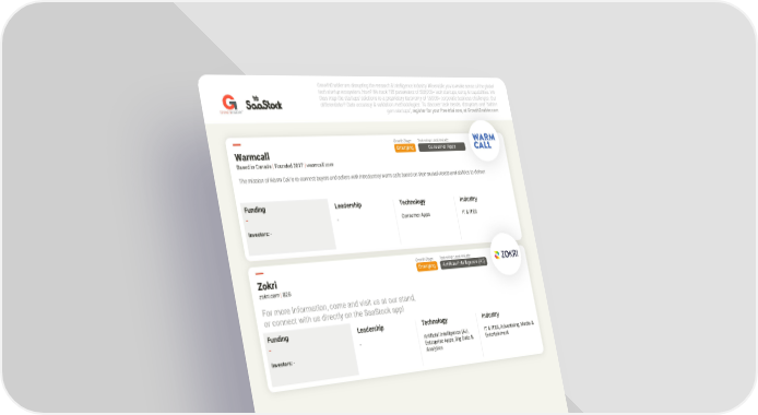 GrowthEnabler are disrupting the research & intelligence industry. We enable you to make sense of the global tech startup ecosystem. How? We track 185 parameters of 500,000+ tech startups, using AI capabilities. We then map the startups' solutions to a proprietary taxonomy of 15,000+ corporate business challenges. Our differentiator? Data accuracy & validation methodologies. To discover tech trends, disruptors and "hidden r ™ Enable owth r G gem startups", register for your free trial now, at GrowthEnabler.com Growth Stage:Technology used include: Warmcall Emerging Consumer Apps Based in Canada | Founded 2017 | warmcall.com The mission of Warm Call is to connect buyers and sellers with introductory warm calls based on their mutual needs and abilities to deliver. Funding Leadership Technology Industry - - Consumer Apps IT & ITES Investors: - Growth Stage:Technology used include: Zokri Emerging Artificial Intelligence (AI) zokri.com | B2B For more information, come and visit us at our stand, or connect with us directly on the SaaStock app! Funding Leadership Technology Industry - - Artificial Intelligence (AI), IT & ITES, Advertising, Media & Investors: - Enterprise Apps, Big Data & Entertainment Analytics Startup Overview - SaaStock Dublin 2018 | 28