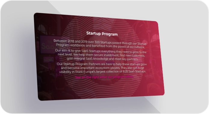 Startup Program Between 2018 and 2019 over 300 Startups passed through our Startup Program worldwide and benefited from the power of our network. Our aim is to give SaaS Startups everything they need to grow to the next level. We help them secure investment, find new customers, gain integral SaaS knowledge and meet key partners. Our Startup Program Partners are here to help these startups grow and become important ecosystem players. They also get huge visibility in front Europe’s largest collection of B2B SaaS Startups. See on the right what our program offers.