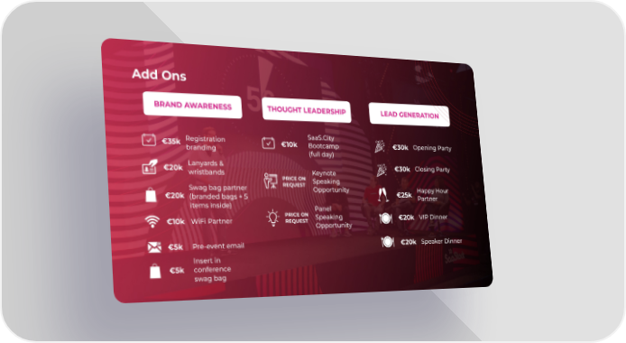 Add Ons BRAND AWARENESS THOUGHT LEADERSHIP LEAD GENERATION Registration SaaS.City €35k branding €10k Bootcamp €30k Opening Party (full day) €20k Lanyards & €30k Closing Party wristbands Keynote PRICE ON Speaking Swag bag partner REQUEST Opportunity Happy Hour €20k (branded bags + 5 €25k Partner items inside) Panel PRICE ON Speaking €20k VIP Dinner €10k WiFi Partner REQUEST Opportunity €5k Pre-event email €20k Speaker Dinner Insert in €5k conference swag bag