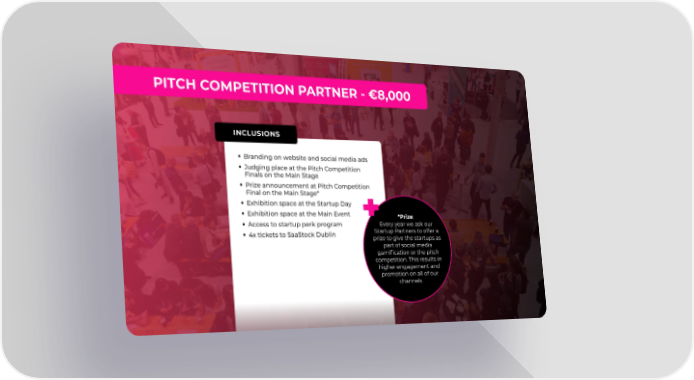 PITCH COMPETITION PARTNER - €8,000 INCLUSIONS • Branding on website and social media ads • Judging place at the Pitch Competition Finals on the Main Stage • Prize announcement at Pitch Competition Final on the Main Stage* • Exhibition space at the Startup Day • Exhibition space at the Main Event + *Prize: • Access to startup perk program Every year we ask our • 4x tickets to SaaStock Dublin Startup Partners to offer a prize to give the startups as part of social media gamification or the pitch competition. This results in higher engagement and promotion on all of our channels