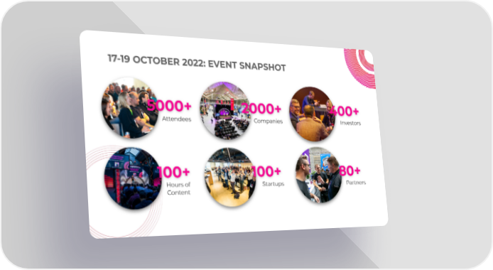 17-19 OCTOBER 2022: EVENT SNAPSHOT 5000+ 2000+ 400+ Attendees Companies Investors 100+ 100+ 80+ Hours of Startups Partners Content