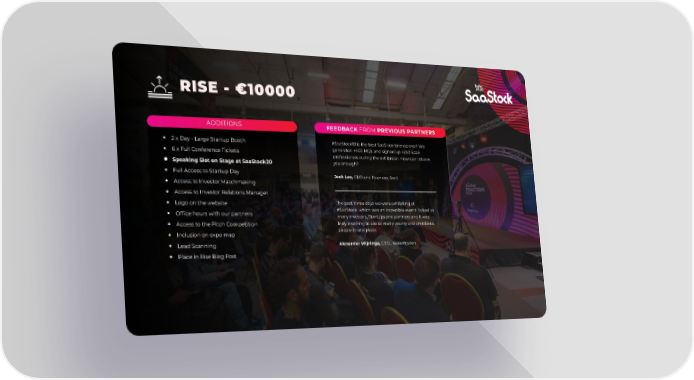 RISE - €10000 ADDITIONS FEEDBACK FROM PREVIOUS PARTNERS • 2 x Day - Large Startup Booth #SaaStock19 is the best SaaS conference ever! We • 6 x Full Conference Tickets generated +300 MQL and signed up +250 SaaS professionals during the exhibition. How can I thank • Speaking Slot on Stage at SaaStock20 you enough? • Full Access to Startup Day Josh Lee, CEO and Founder, Swit • Access to Investor Matchmaking • Access to Investor Relations Manager • Logo on the website The past three days we were exhibiting at #SaaStock, which was an incredible event! Talked to • Office hours with our partners many investors, StartUps and partners and it was • Access to the Pitch Competition truly inspiring to see so many young and ambitious people in one place. • Inclusion on expo map • Lead Scanning Alexander Wijninga, CEO , Watermelon • Place in Rise Blog Post