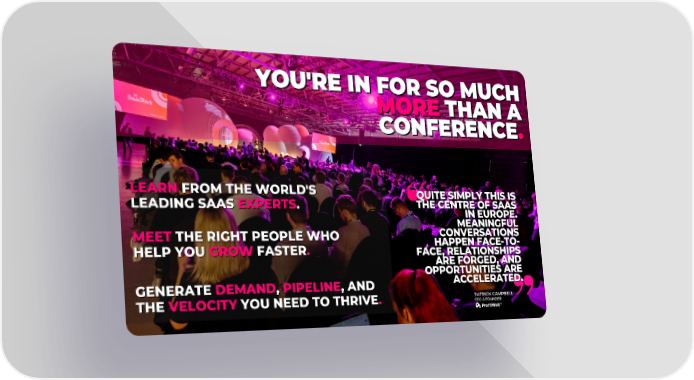 YOU'RE IN FOR SO MUCH YOU'RE IN FOR SO MUCH MORE THAN A MORE THAN A CONFERENCE. CONFERENCE. LEARN FROM THE WORLD'S LEARN FROM THE WORLD'S QUITE SIMPLY THIS IS QUITE SIMPLY THIS IS THE CENTRE OF SAAS THE CENTRE OF SAAS LEADING SAAS EXPERTS. LEADING SAAS EXPERTS. IN EUROPE. IN EUROPE. MEANINGFUL MEANINGFUL CONVERSATIONS CONVERSATIONS MEET THE RIGHT PEOPLE WHO MEET THE RIGHT PEOPLE WHO HAPPEN FACE-TO- HAPPEN FACE-TO- HELP YOU GROW FASTER. HELP YOU GROW FASTER. FACE, RELATIONSHIPS FACE, RELATIONSHIPS ARE FORGED, AND ARE FORGED, AND OPPORTUNITIES ARE OPPORTUNITIES ARE ACCELERATED. ACCELERATED. GENERATE DEMAND, PIPELINE, AND GENERATE DEMAND, PIPELINE, AND PATRICK CAMPBELL PATRICK CAMPBELL THE VELOCITY YOU NEED TO THRIVE. CEO & FOUNDER CEO & FOUNDER THE VELOCITY YOU NEED TO THRIVE.