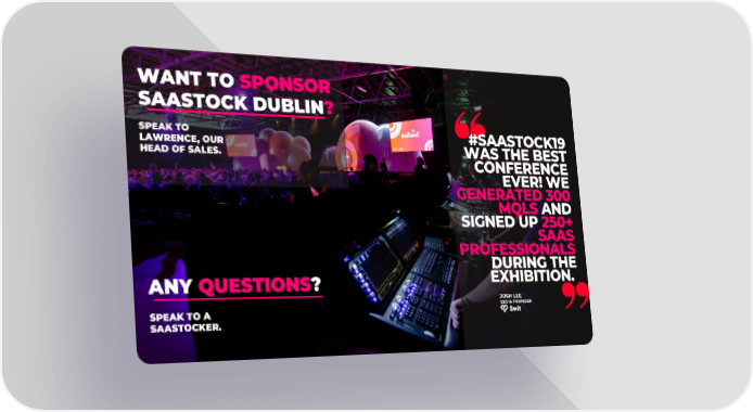 WANT TO SPONSOR WANT TO SPONSOR SAASTOCK DUBLIN? SAASTOCK DUBLIN? SPEAK TO SPEAK TO #SAASTOCK19 #SAASTOCK19 LAWRENCE, OUR LAWRENCE, OUR WAS THE BEST WAS THE BEST HEAD OF SALES. HEAD OF SALES. CONFERENCE CONFERENCE EVER! WE EVER! WE GENERATED 300 GENERATED 300 MQLS AND MQLS AND SIGNED UP 250+ SIGNED UP 250+ SAAS SAAS PROFESSIONALS PROFESSIONALS DURING THE DURING THE EXHIBITION. EXHIBITION. ANY QUESTIONS? ANY QUESTIONS? JOSH LEE JOSH LEE CEO & FOUNDER CEO & FOUNDER SPEAK TO A SPEAK TO A SAASTOCKER. SAASTOCKER.