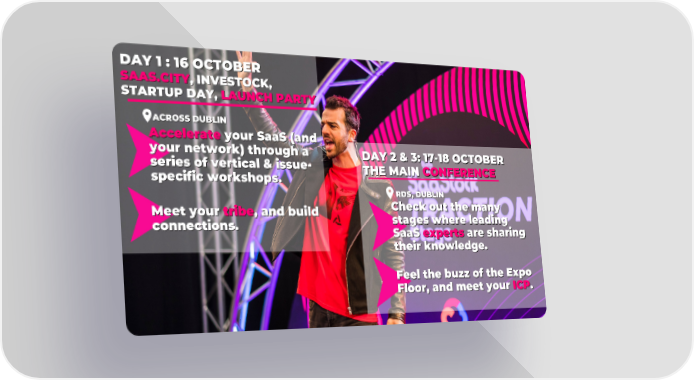 DAY 1 : 16 OCTOBER DAY 1 : 16 OCTOBER SAAS.CITY, INVESTOCK, SAAS.CITY, INVESTOCK, STARTUP DAY, LAUNCH PARTY STARTUP DAY, LAUNCH PARTY ACROSS DUBLIN ACROSS DUBLIN Accelerate your SaaS (and Accelerate your SaaS (and your network) through a your network) through a DAY 2 & 3: 17-18 OCTOBER DAY 2 & 3: 17-18 OCTOBER series of vertical & issue- series of vertical & issue- THE MAIN CONFERENCE THE MAIN CONFERENCE specific workshops. specific workshops. RDS, DUBLIN RDS, DUBLIN Check out the many Check out the many Meet your tribe, and build Meet your tribe, and build stages where leading stages where leading connections. connections. SaaS experts are sharing SaaS experts are sharing their knowledge. their knowledge. Feel the buzz of the Expo Feel the buzz of the Expo Floor, and meet your ICP. Floor, and meet your ICP.