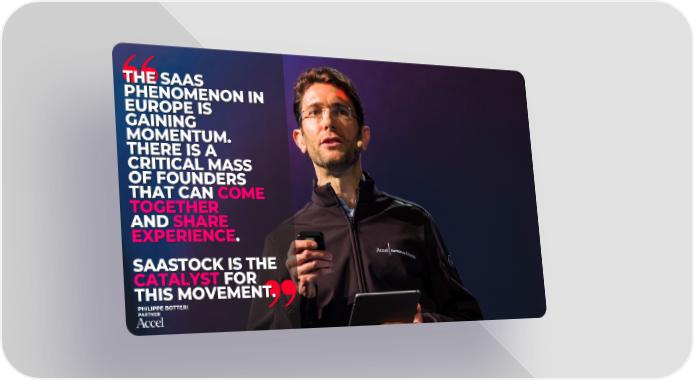 THE SAAS THE SAAS PHENOMENON IN PHENOMENON IN EUROPE IS EUROPE IS GAINING GAINING MOMENTUM. MOMENTUM. THERE IS A THERE IS A CRITICAL MASS CRITICAL MASS OF FOUNDERS OF FOUNDERS THAT CAN COME THAT CAN COME TOGETHER TOGETHER AND SHARE AND SHARE EXPERIENCE. EXPERIENCE. SAASTOCK IS THE SAASTOCK IS THE CATALYST FOR CATALYST FOR THIS MOVEMENT. THIS MOVEMENT. PHILIPPE BOTTERI PHILIPPE BOTTERI PARTNER PARTNER